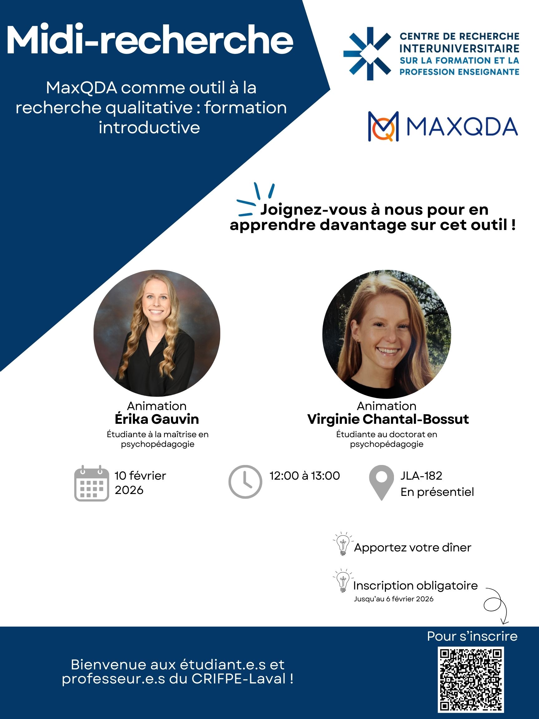 Description de la formation: La présente formation a pour objectif général de présenter et de faire connaître, principalement à la communauté étudiante, le logiciel MaxQDA comme outil à la recherche qualitative. Pour ce faire, lors de cette formation, nous aborderons les fonctionnalités de base de l’outil MaxQDA (p. ex. l’importation de documents audio et écrits, l’usage de la paraphrase et de notes personnelles) de même que celles du codage. Il est important de souligner que cette formation se veut une initiation et une exploration de l’outil. Ainsi, plusieurs fonctionnalités liées aux recherches à devis mixtes et aux analyses ne seront pas abordées.